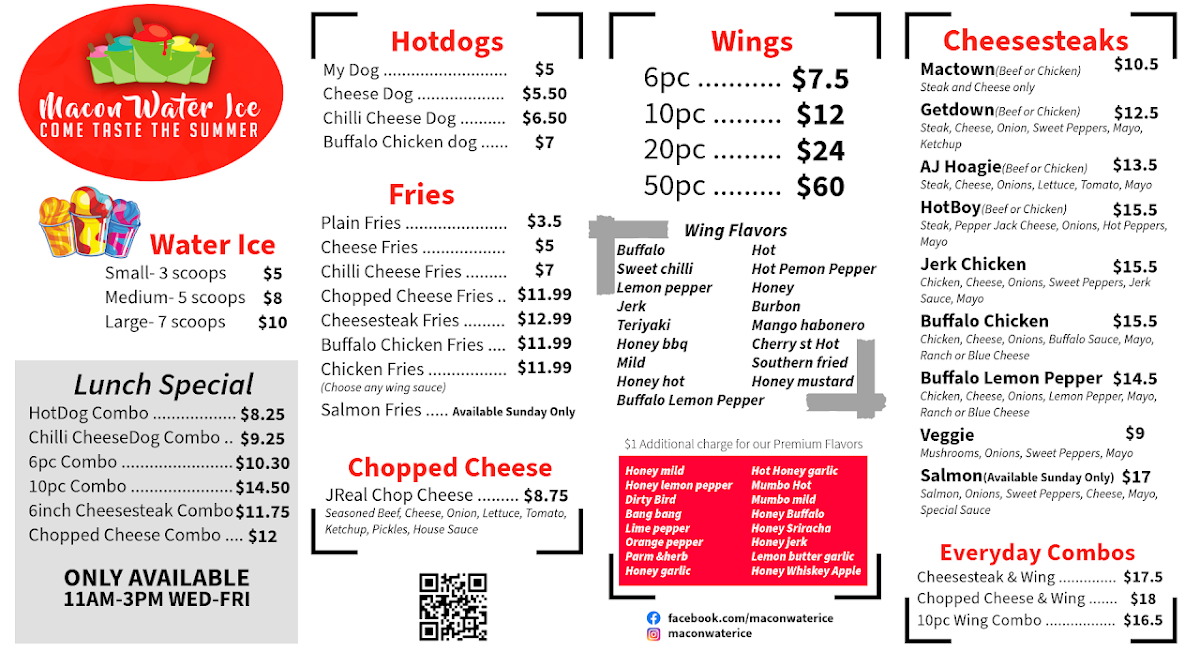 The menu at Macon Water Ice offers a variety of delicious comfort foods with something for everyone. For hot dog lovers, options like the My Dog, Cheese Dog, and Chilli Cheese Dog provide classic tastes, while the Buffalo Chicken Dog adds a flavorful twist. The fries selection is equally impressive, with choices like Plain Fries, Cheese Fries, Chilli Cheese Fries, and Cheesesteak Fries, each packed with savory toppings. Fans of hearty sandwiches can indulge in the JReal Chop Cheese, a standout in the chopped cheese category. When it comes to wings, diners can choose from 6pc, 10pc, 20pc, or even 50pc for those with a bigger appetite. Cheesesteak options include favorites like the Mactown (available in both beef and chicken), Getdown, AJ Hoagie, HotBoy, and the flavorful Jerk Chicken. For a sweet treat, the Water Ice comes in three sizes: Small (3 scoops), Medium (5 scoops), and Large (7 scoops). The Lunch Specials and Everyday Combos offer great deals, such as the HotDog Combo, Chilli CheeseDog Combo, 6pc Combo, and 10pc Combo, as well as combos featuring cheesesteaks and wings, like the Cheesesteak & Wing and Chopped Cheese & Wing. Overall, Macon Water Ice offers a satisfying selection of tasty dishes at reasonable prices, making it a great spot to grab a quick and fulfilling meal.